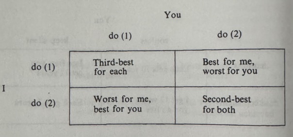 Summary: Parfit now defines another way of being self-defeating: “directly”. He does not think this applies to Consequentialism, but he does think Self-interest theory can be “directly collectively self-defeating”. The two-person Prisoner’s Dilemma is a simple example of this, though he doesn’t think it arises much in the real world. But the Many-Person Dilemma comes up frequently in the real world: situations where each person doing what’s in their own best interests results in everyone being worse off. This is at least a “practical problem” for Self-interest theory. Parfit lists five general approaches for addressing this practical problem.