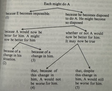 Thoughts: Most of this made sense to me, but I have some nagging discomfort around Parfit’s discussion of “ought implies can”. He thinks that if we’re going to deny that I ought to have done something, on the grounds that I couldn’t have done it, then the relevant notion of couldn’t is: “acting in this way would have been impossible, even if my desires and dispositions had been different”(Parfit 15) (regardless of whether there was any way, given the state of the universe and the laws of nature, for my desires/dispositions to actually be different). I agree, but I wonder if this undermines his grounds for saying that adopting certain motives which lead to “rational irrationality” or “moral immorality” are rational/moral in the first place. Why, for example, should we say that it’s moral for a parent to love their child in a way that may lead to immoral behavior in certain circumstances?(Parfit 32–33) Wouldn’t it be more moral to both love the child and have a disposition to disregard that love when the love would lead one to act immorally? Parfit seems to reject this on the grounds that it’s psychologically impossible, but if he’s not going to allow that as a defense against saying we ought to have performed some act, it seems inconsistent to use it as a defense against saying we ought to have adopted some disposition.