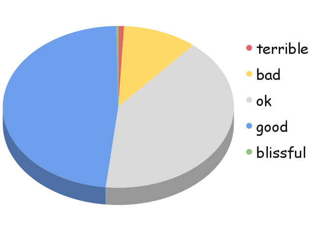 Since mid-December 2024 I've kept a log rating each day on a 5-point scale. I'm pleasantly surprised to see good days outnumbered neutral ones.