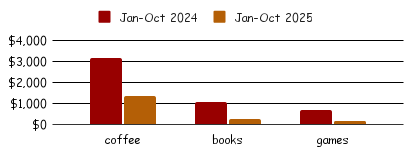 Last year I lightly scolded myself for how much I spent at coffee shops and on books and video games. I did better this year: